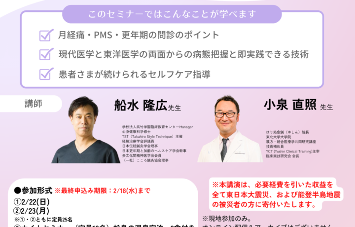 「耳鳴り・難聴」・「自律神経失調症」・「不眠症」・「更年期障害」・「月経のトラブル」・「頭痛の最新治療」など基礎講座では触れていない内容について、受講生からリクエストの多かったものを中心に講義していきます。