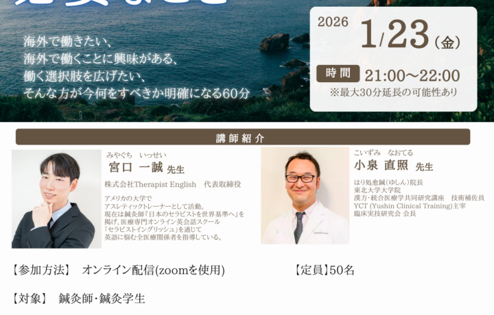 YCTの主宰者である小泉直照先生は、臨床経験19年、大学病院の鍼灸外来でも提供する高度な鍼灸技術を公開しています。鍼灸専門学校の教員として国家試験合格率100%を達成した教育ノウハウを持ち、これまでに延べ4,300人以上の鍼灸師や鍼灸学生を指導してきました。さらに、業界の第一線で活躍する著名な鍼灸師や医師・薬剤師を招いたコラボセミナーも開催し、最新の鍼灸施術や研究結果を学ぶ機会を提供します。